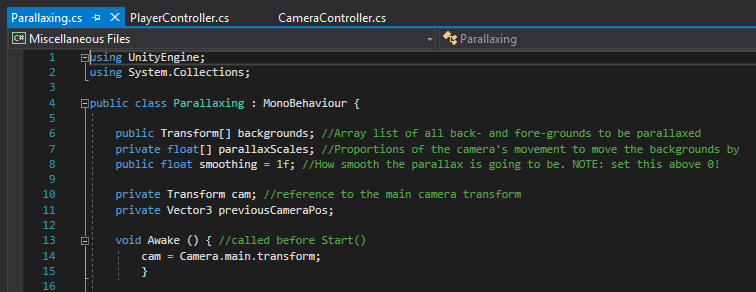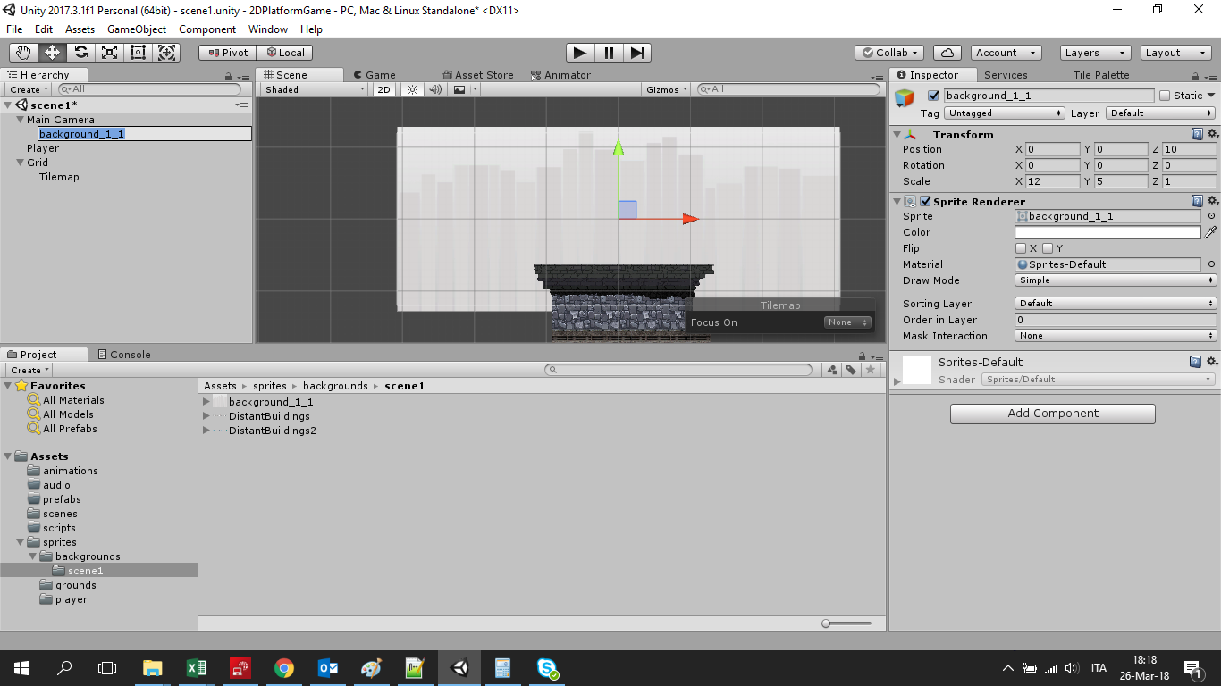 When you create a new scene, by default Unity will create the scene and a "Main Camera" object. In this game, I want to have scrolling backgrounds with parallax. To do that, firstly I add a background to the camera. This one will be a fixed background associated to the camera and always present on the screen. It will also be the farthest. Scale it to adapt it to the screen size.