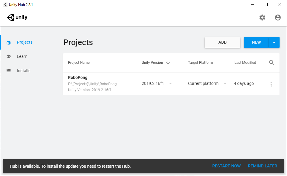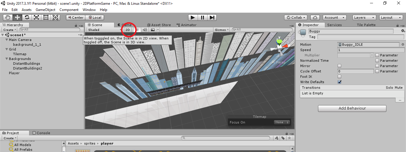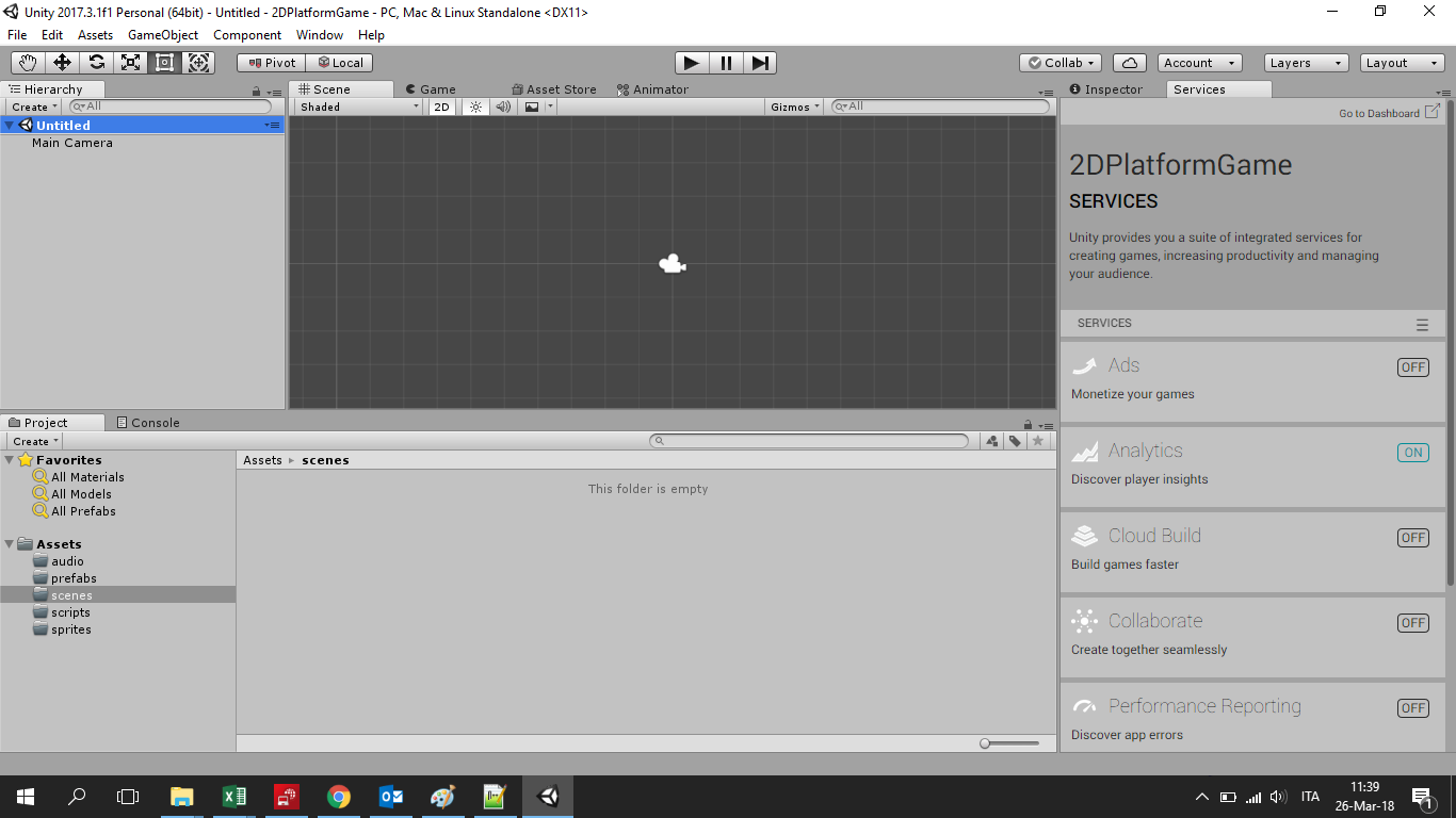 Once Unity has been installed, run it and start a new project. Select the location you want to store data, type the name, and select 2D option. Note: Be sure you have write access to your project's folder to avoid Access Denied errors.