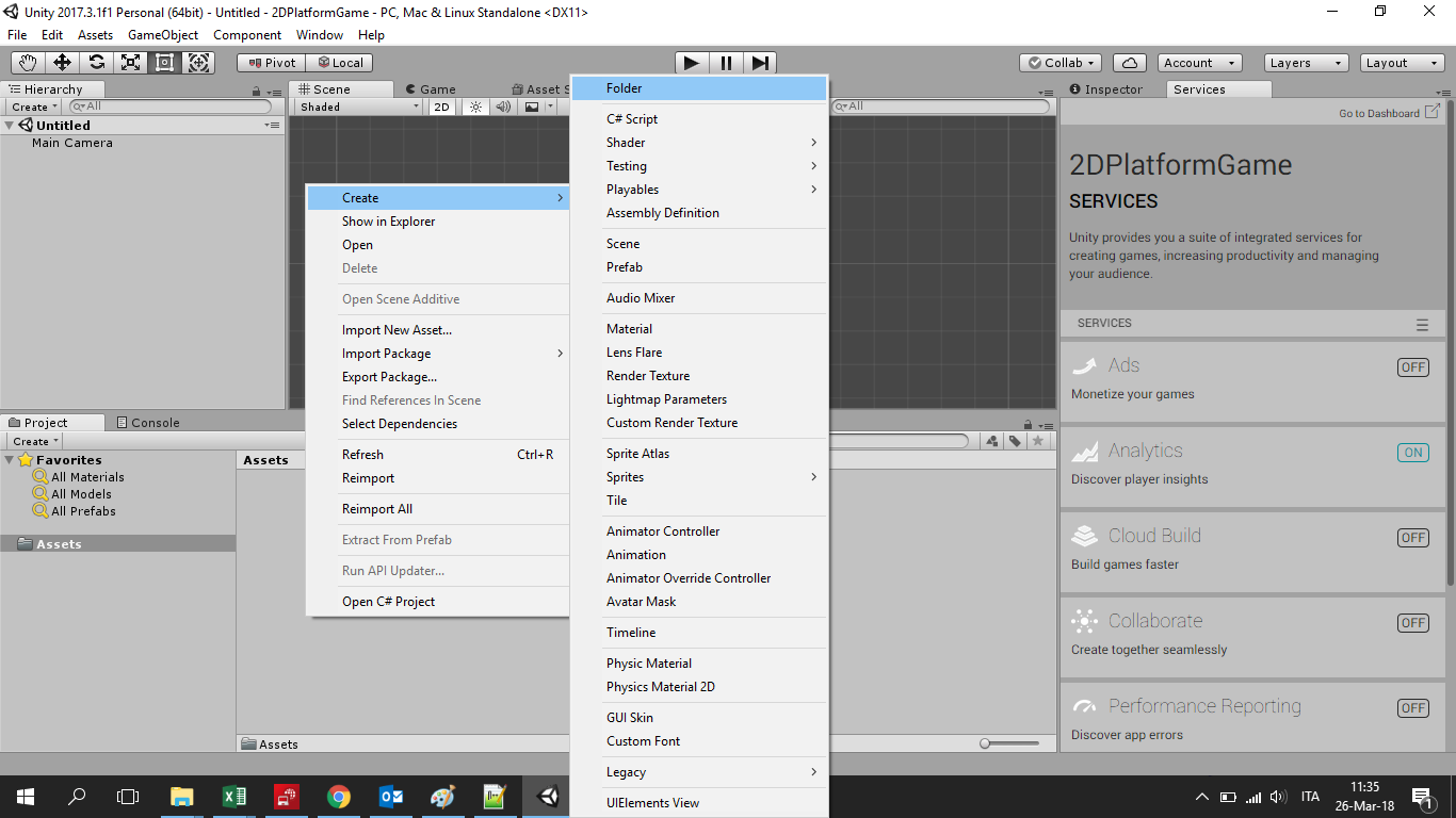 First of all, you have to know that you can import 2D assets already prepared by Unity, to simplify your work. There are two way to get them. You can go on the project panel and right, and then select "import Package" in the context menu.